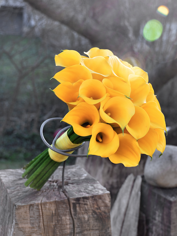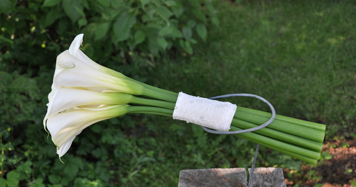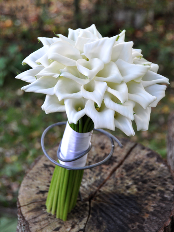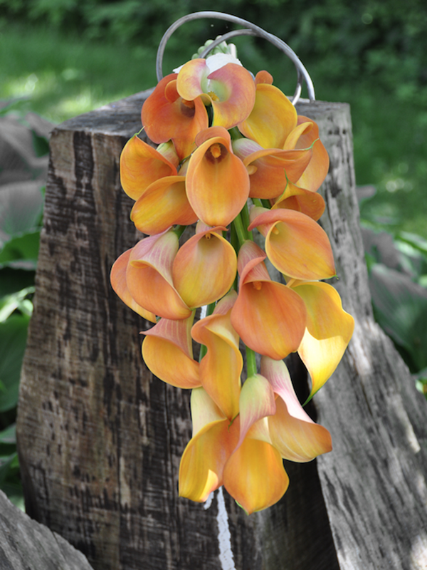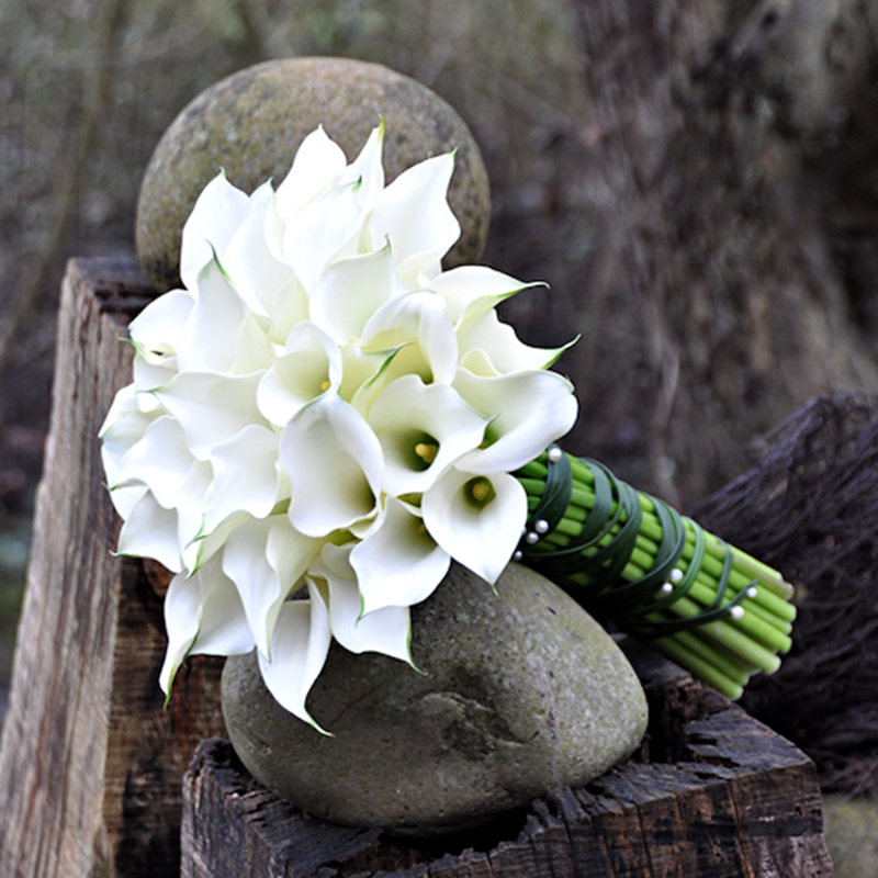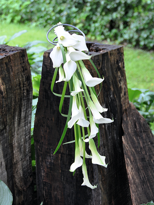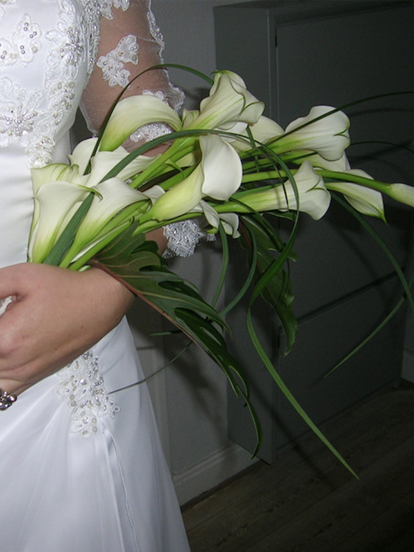 Skal brudebuketten være anderledes, er en armbuket af Calla meget elegant og enkel. Armbuketten bæres, så den ligger i armen. Den enkle brudebuket egner sig både til enkle brudekjoler med rene linjer og til brudekjoler med mange detaljer. Calla og orkideer er to blomster som ikke safter, det vil sige at de ikke laver pletter på brudekjolen. Derfor kan de med sindsro bindes med stilkene ude.