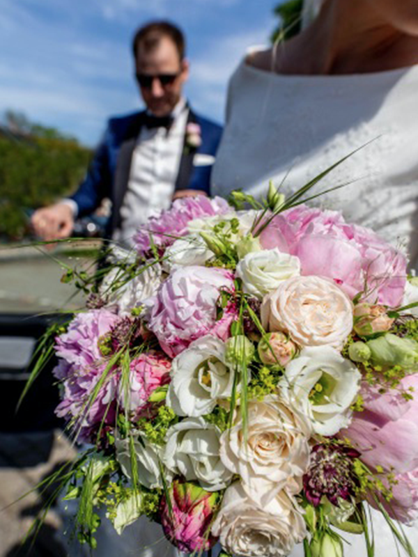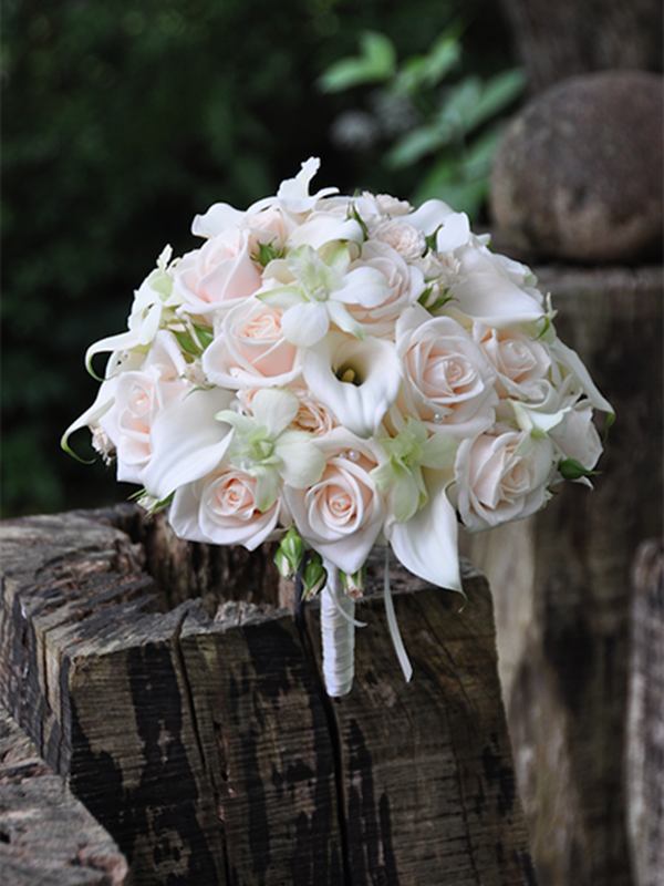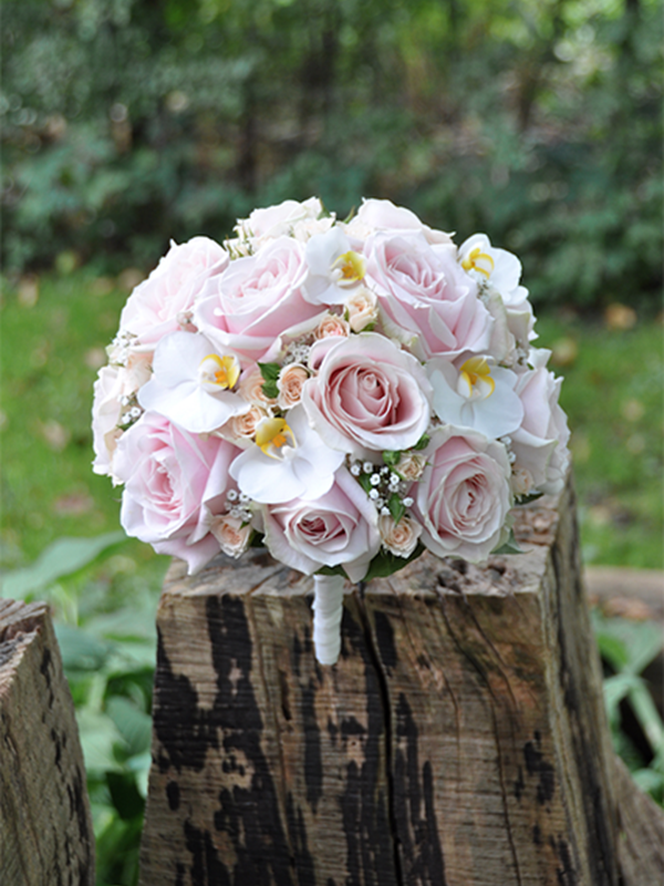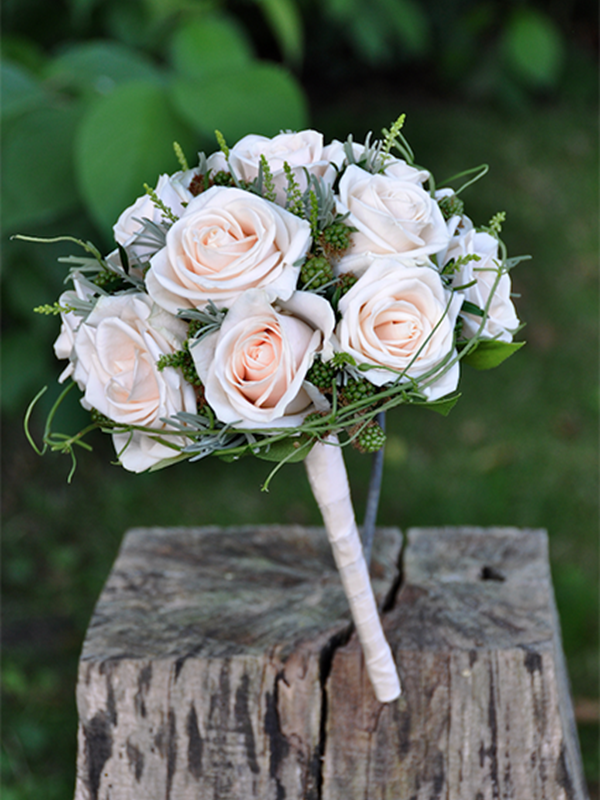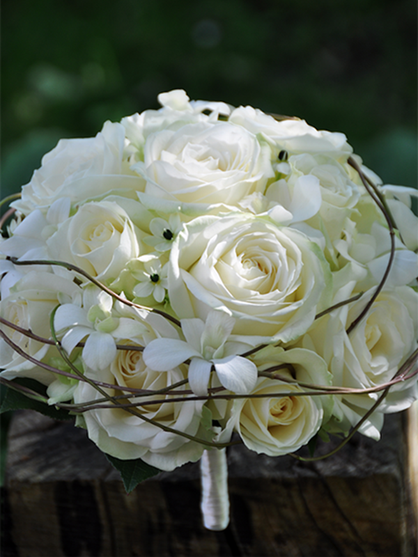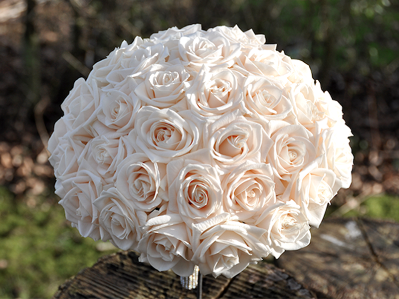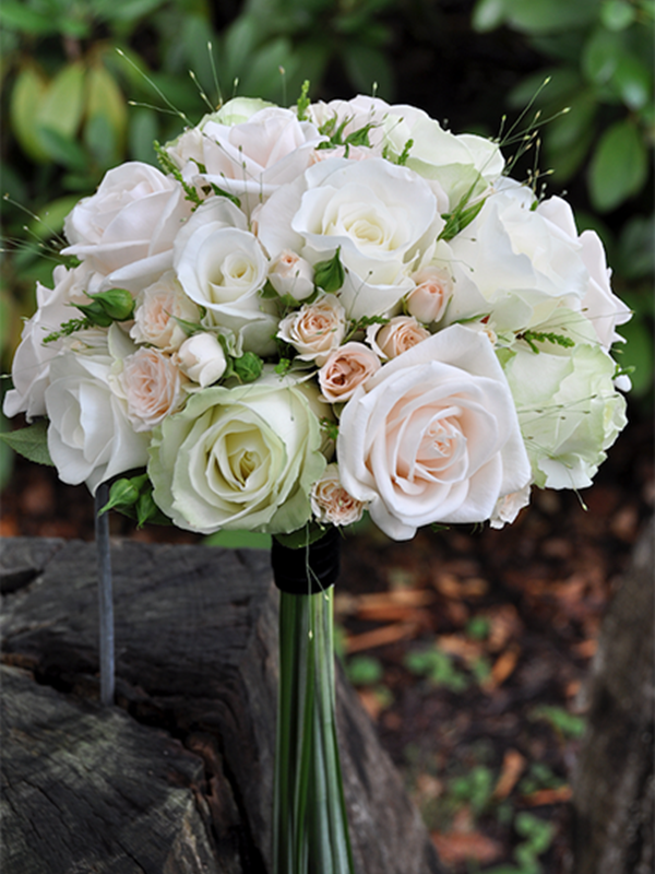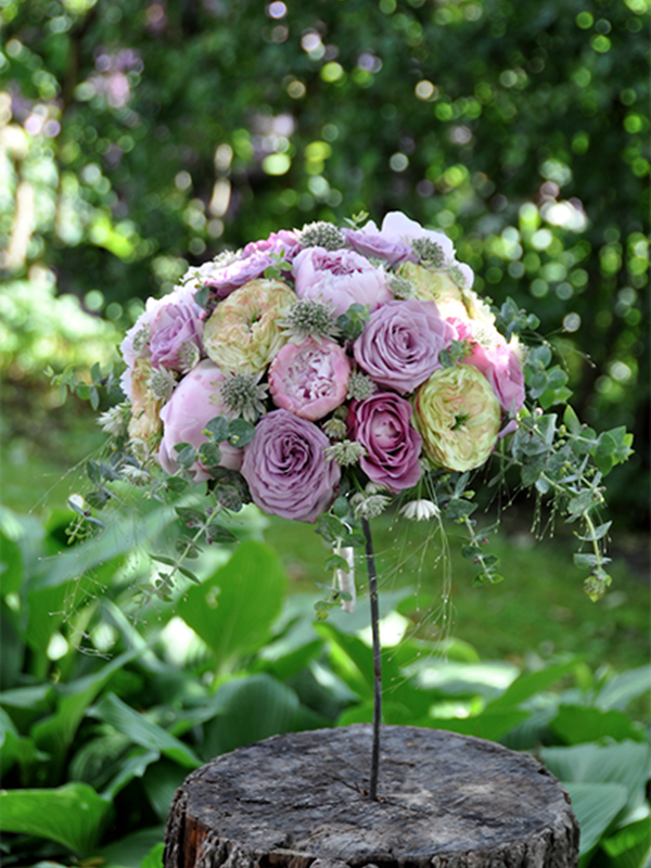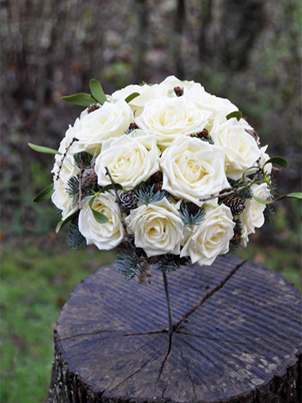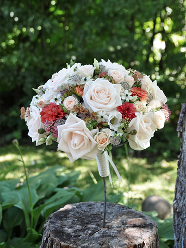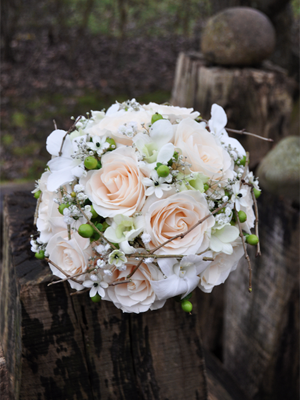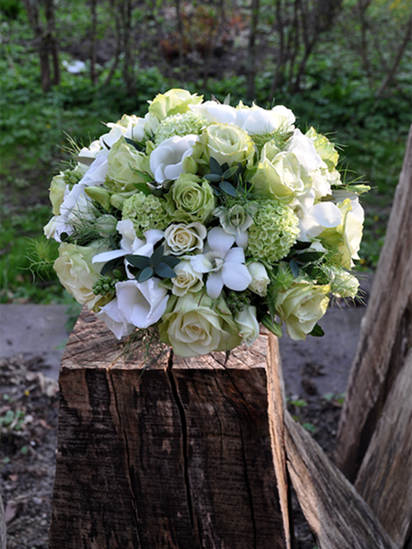 Brudebuketten er supernem at bære og meget ren i sit udtryk. Ud fra brudekjolens snit og brudeparrets smag vælger vi detaljer, diameter og længden på skaftet. På den måde kan den runde brudebuket tilpasses alle.