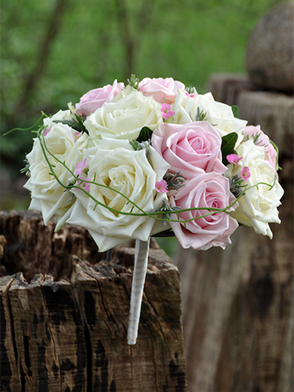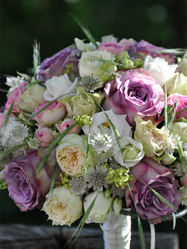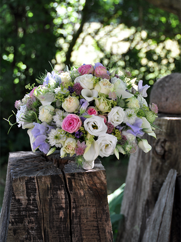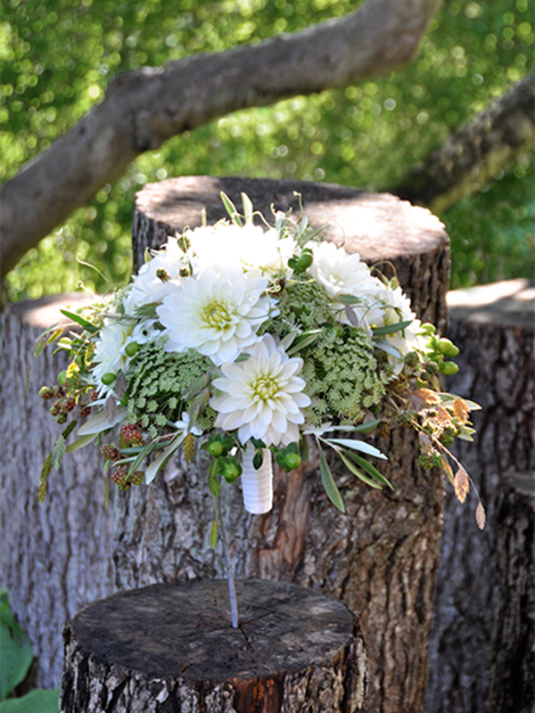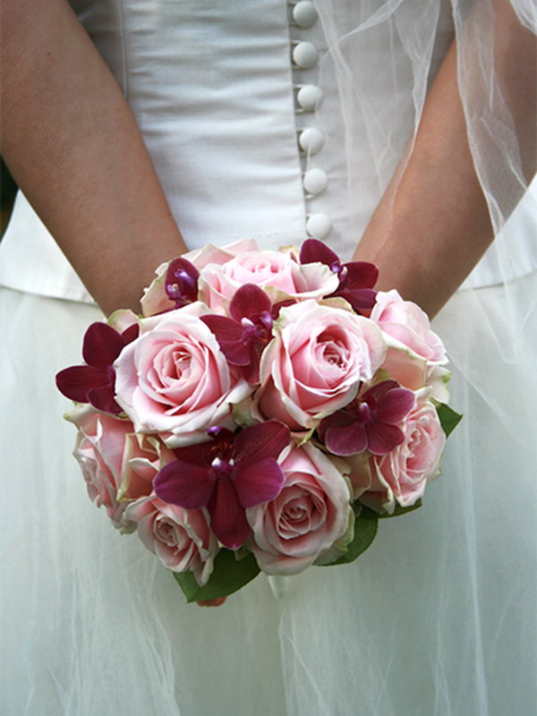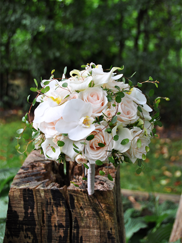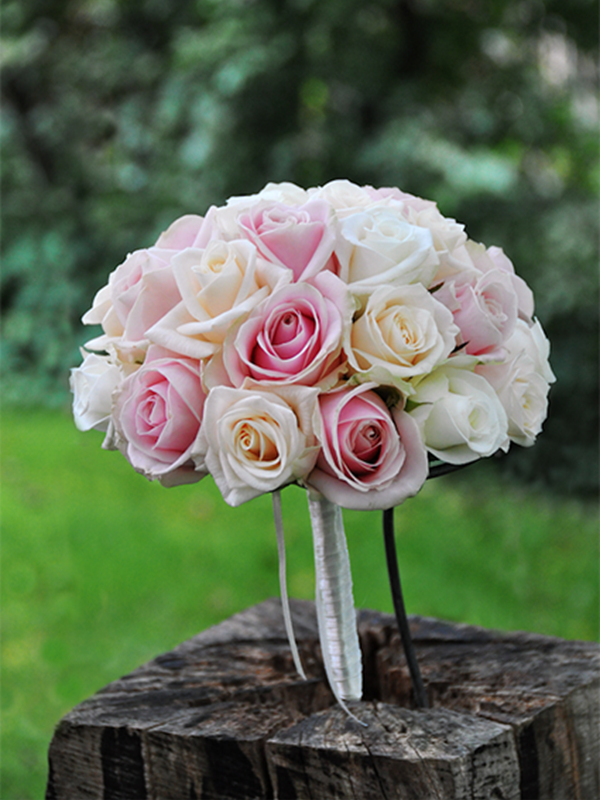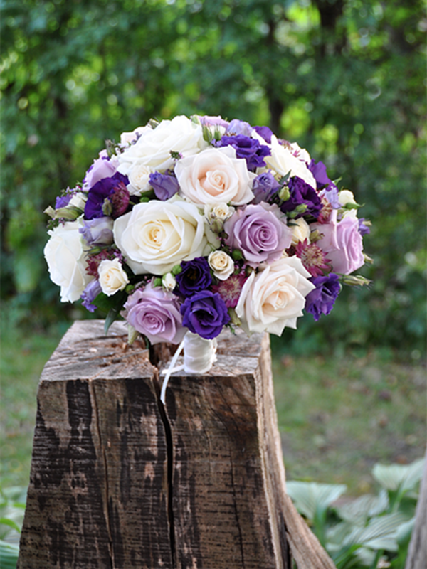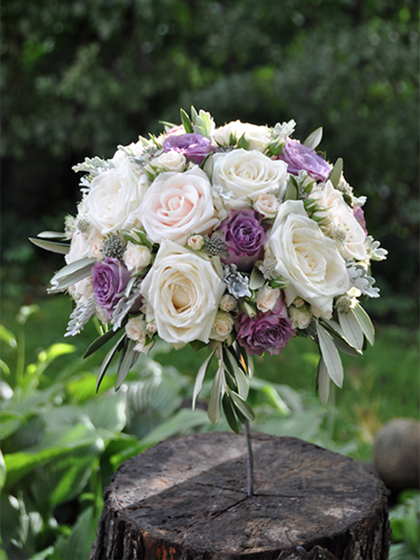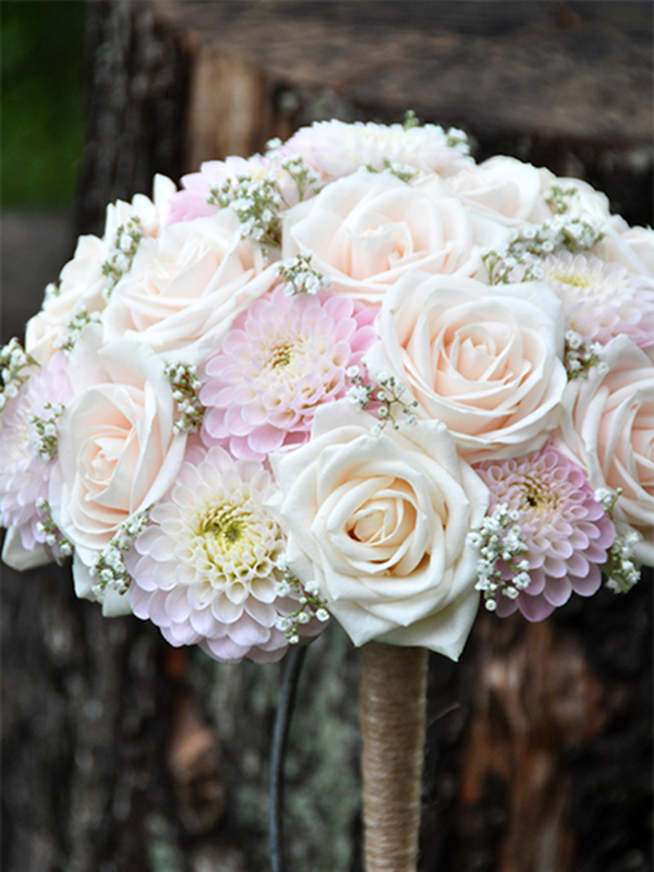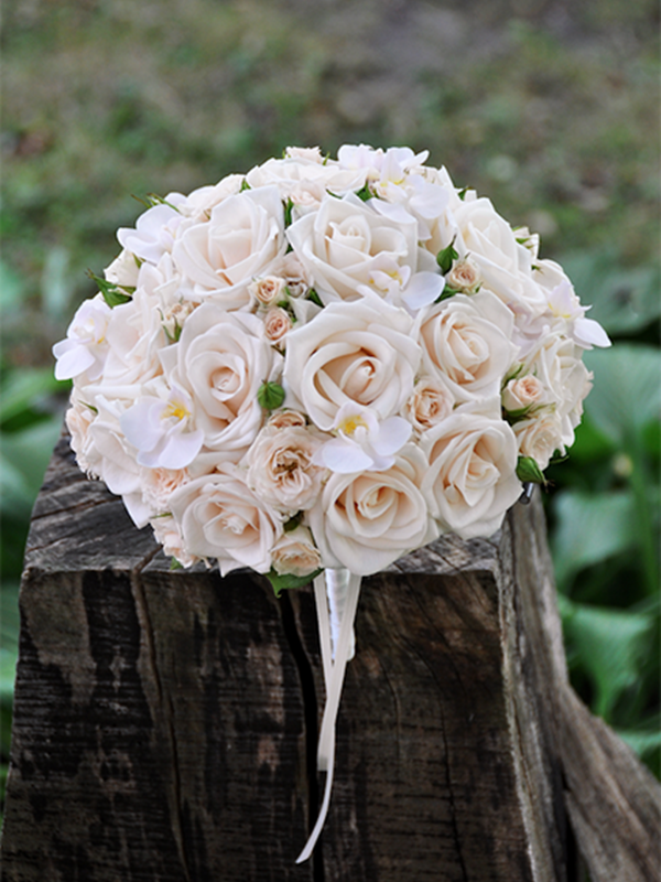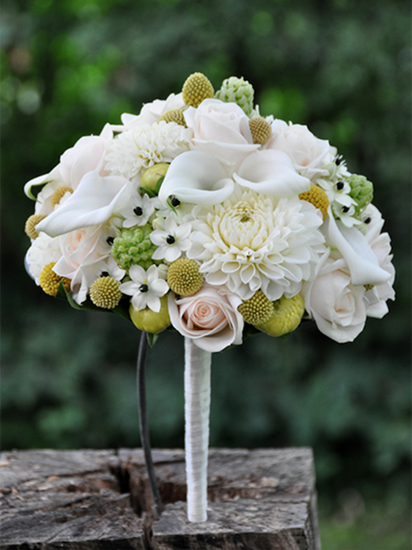 Brudebuketten er supernem at bære og meget ren i sit udtryk. Ud fra brudekjolens snit og brudeparrets smag vælger vi detaljer, diameter og længden på skaftet. På den måde kan den runde brudebuket tilpasses alle.