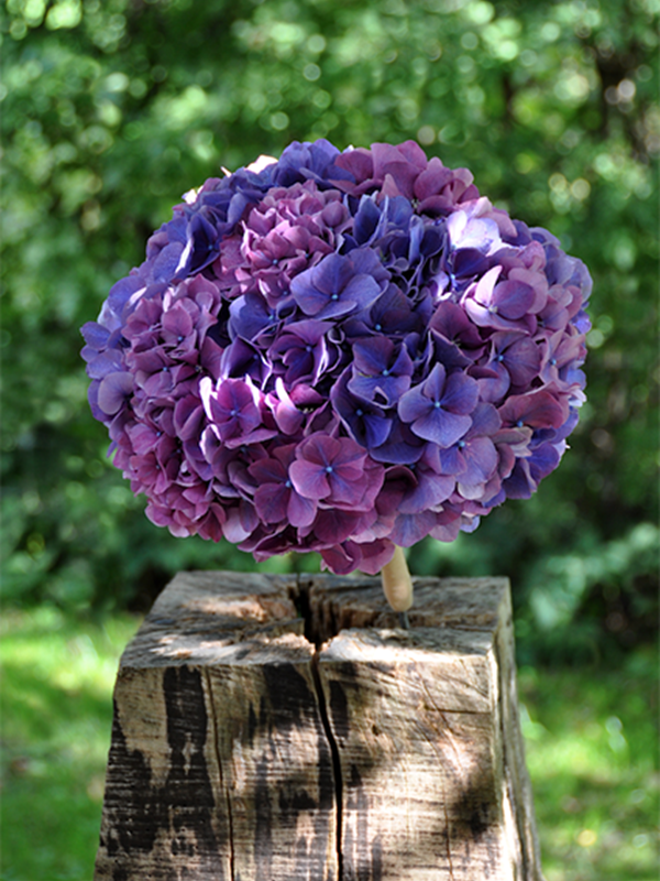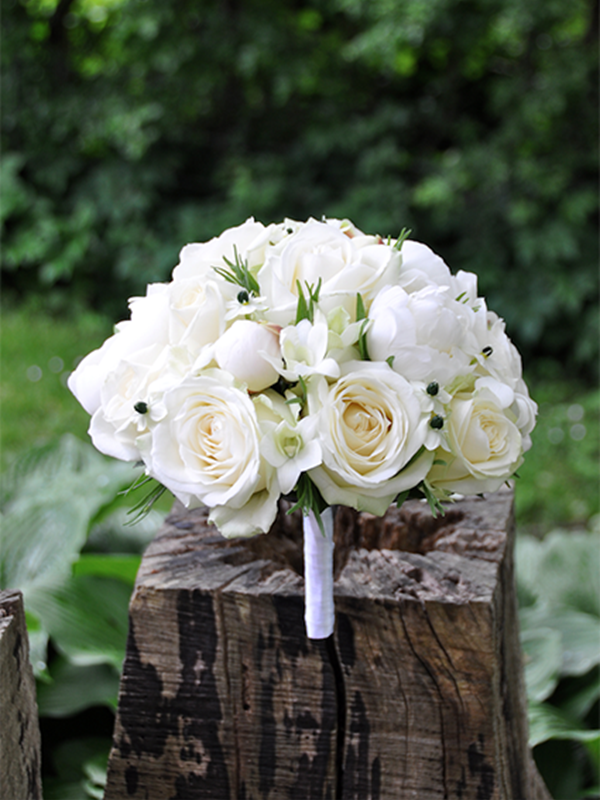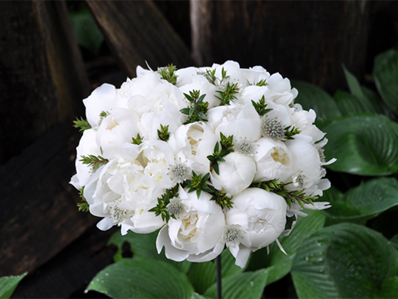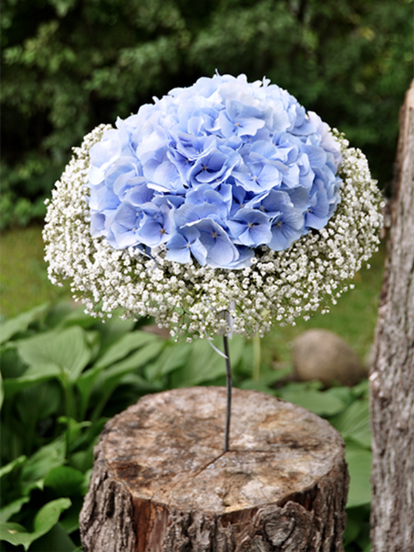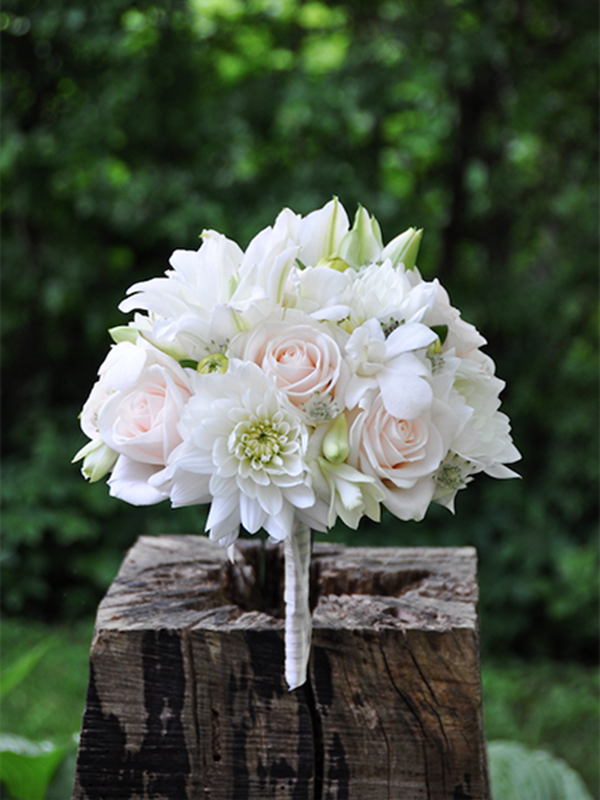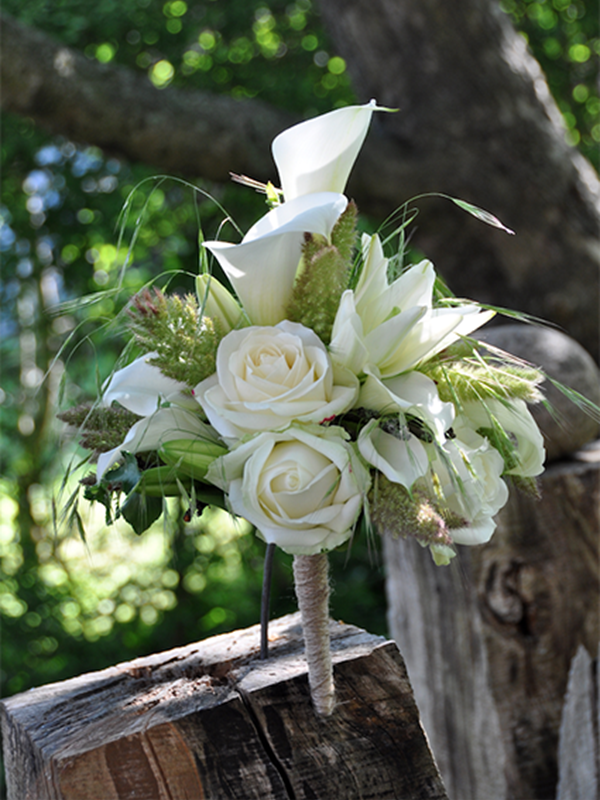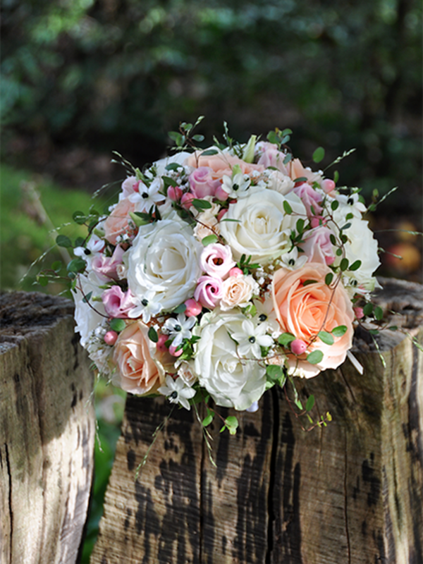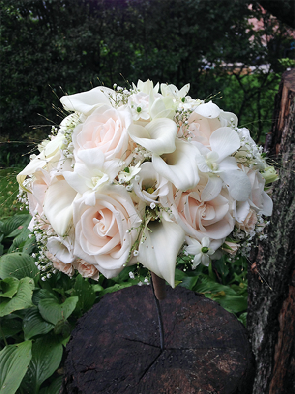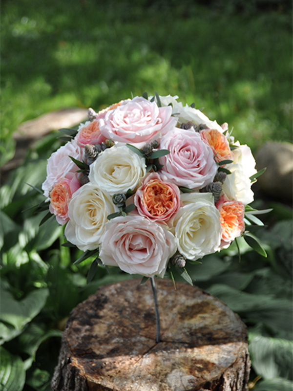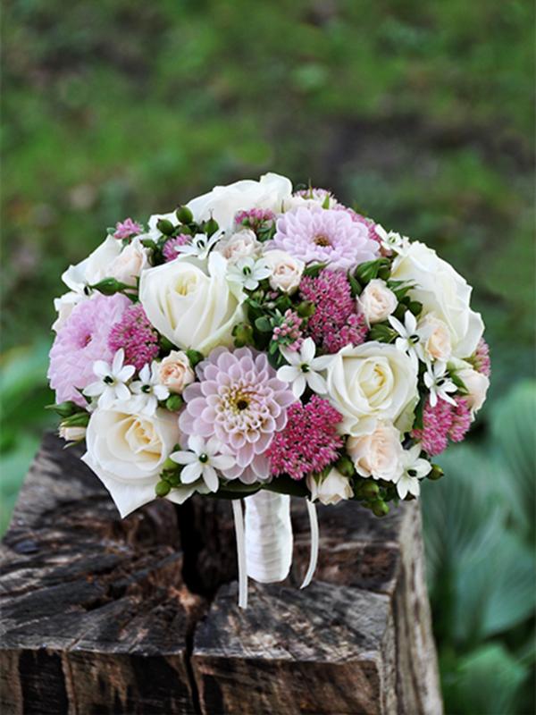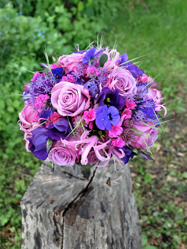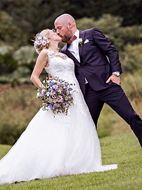 Brudebuketten er supernem at bære og meget ren i sit udtryk. Ud fra brudekjolens snit og brudeparrets smag vælger vi detaljer, diameter og længden på skaftet. På den måde kan den runde brudebuket tilpasses alle.