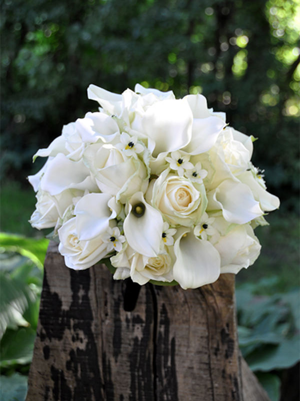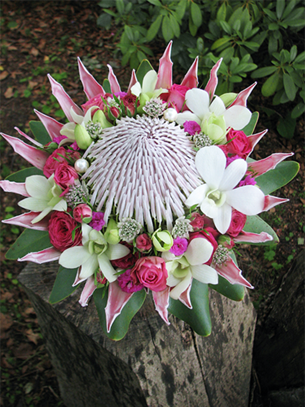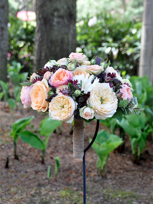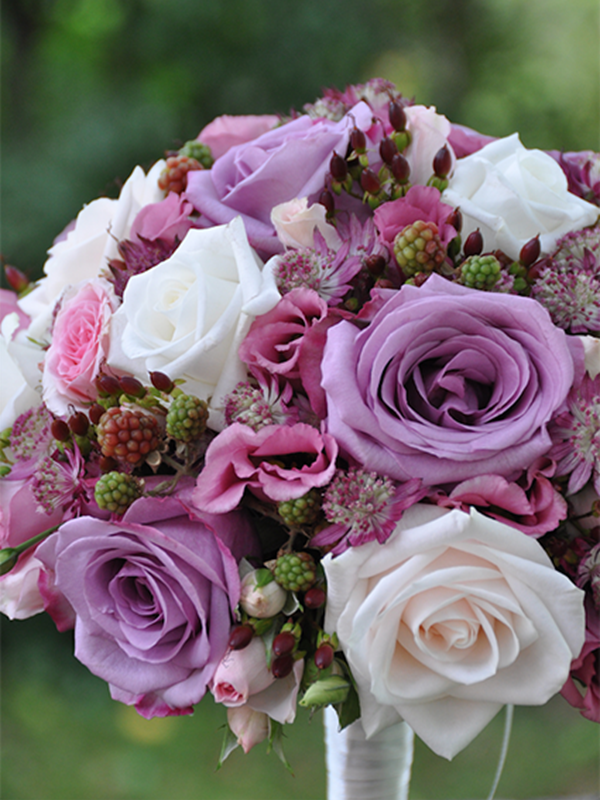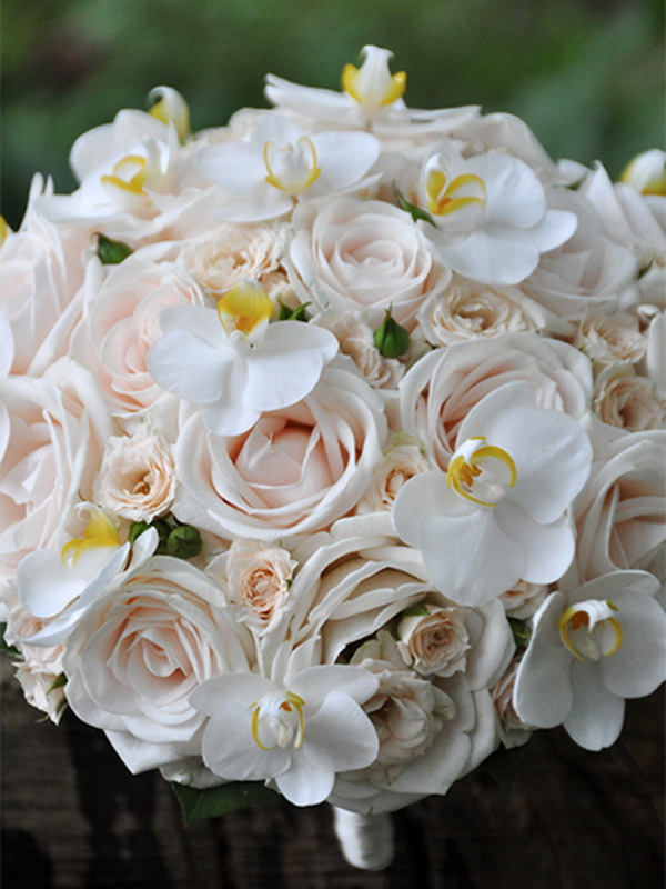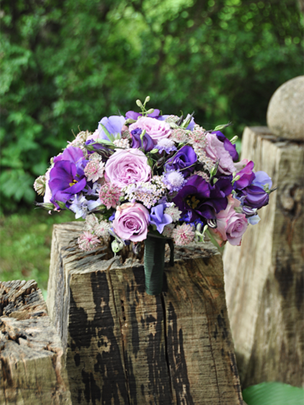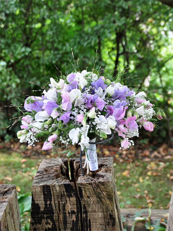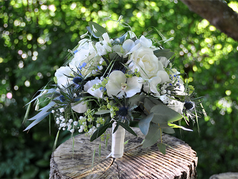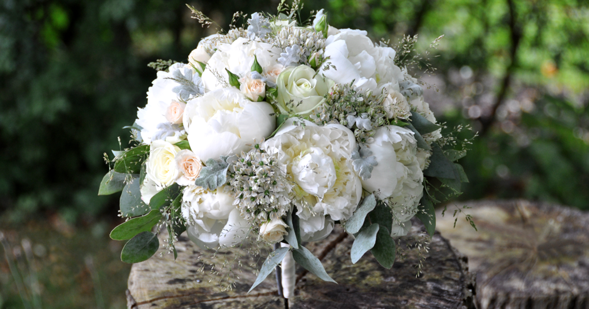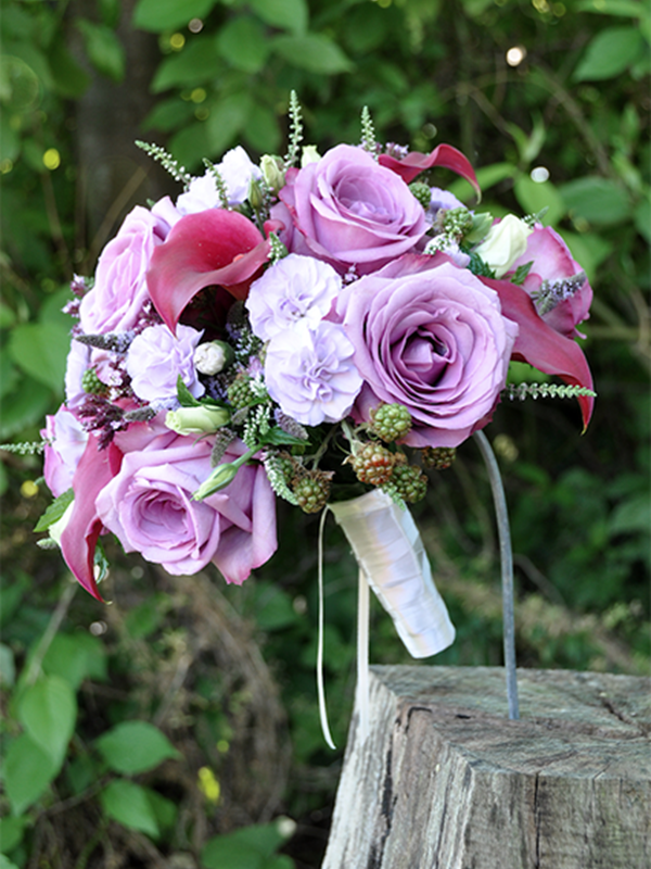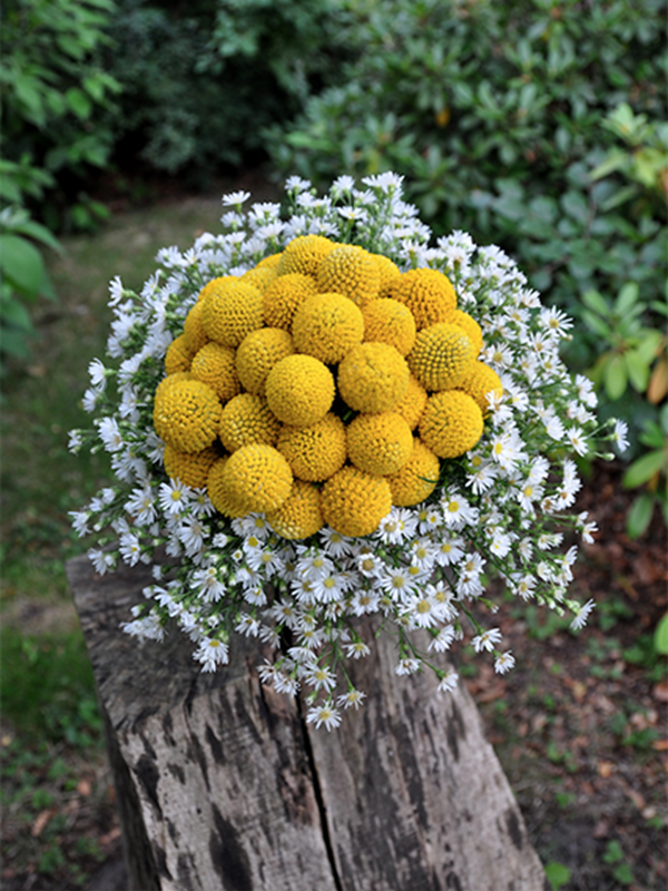Brudebuketten er supernem at bære og meget ren i sit udtryk. Ud fra brudekjolens snit og brudeparrets smag vælger vi detaljer, diameter og længden på skaftet. På den måde kan den runde brudebuket tilpasses alle.