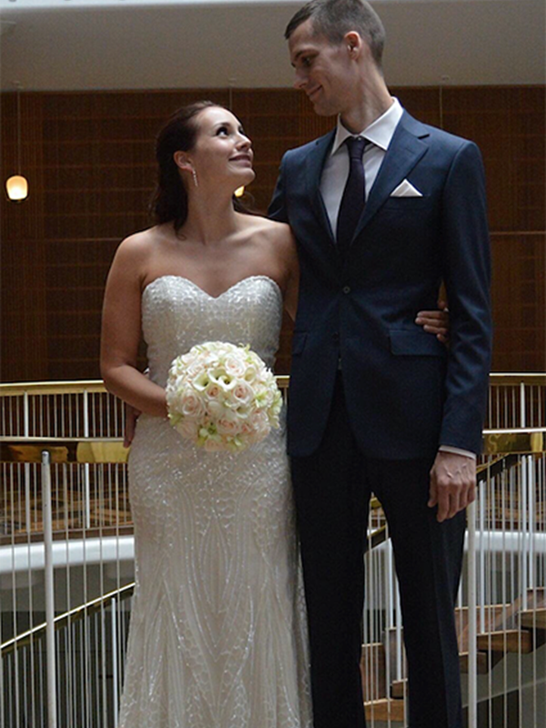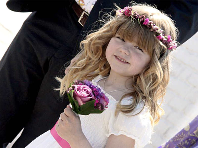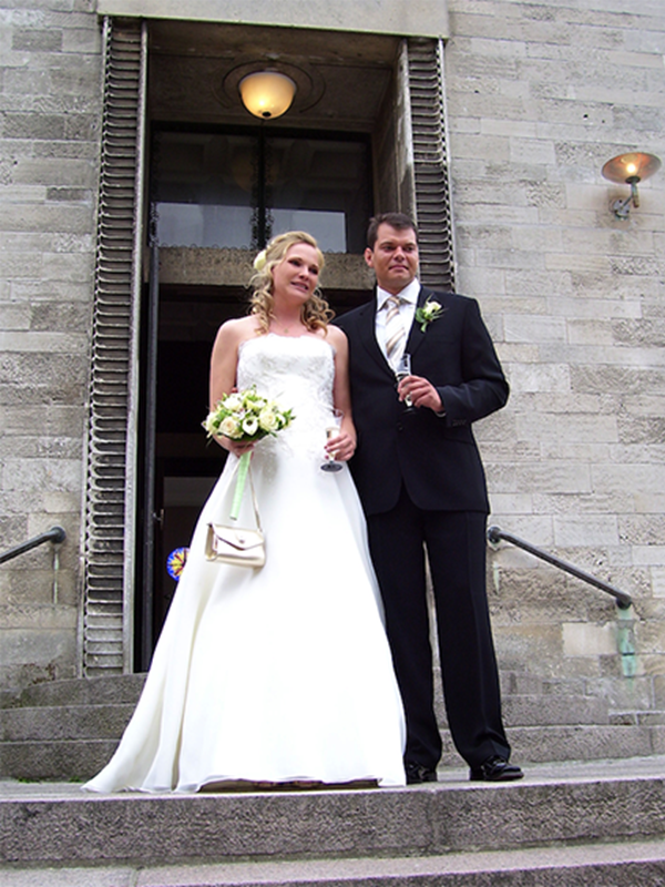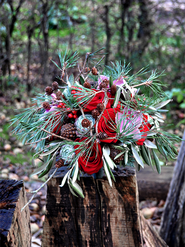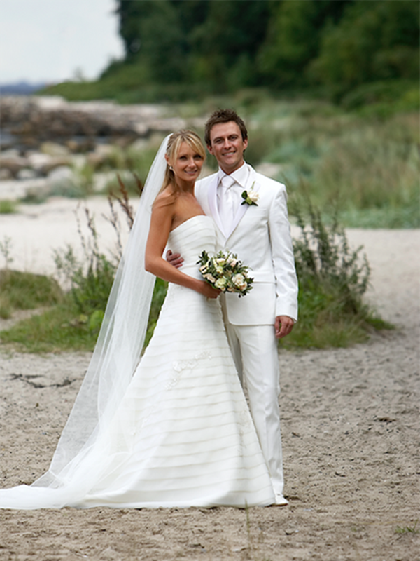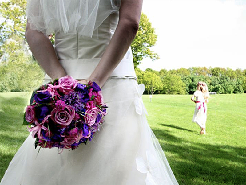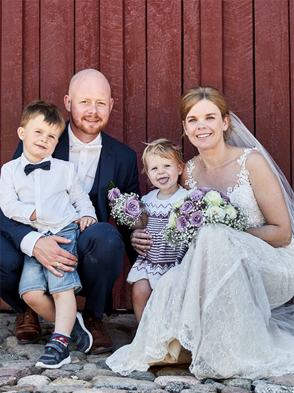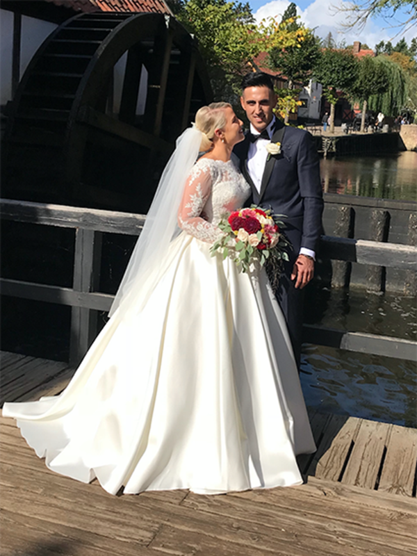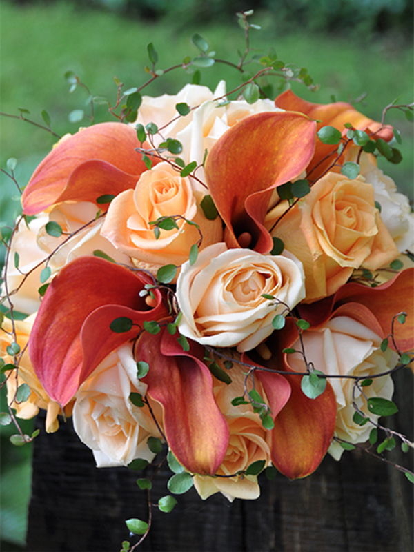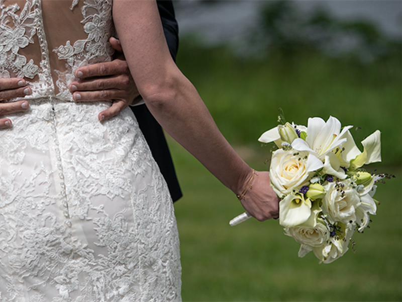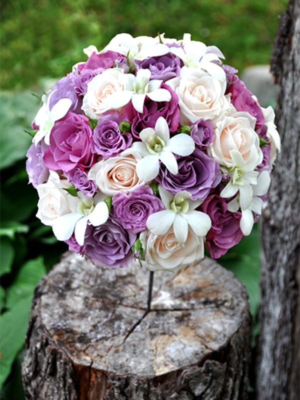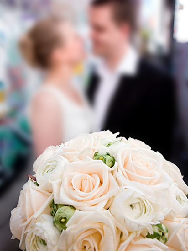 Brudebuketten er supernem at bære og meget ren i sit udtryk. Ud fra brudekjolens snit og brudeparrets smag vælger vi detaljer, diameter og længden på skaftet. På den måde kan den runde brudebuket tilpasses alle.