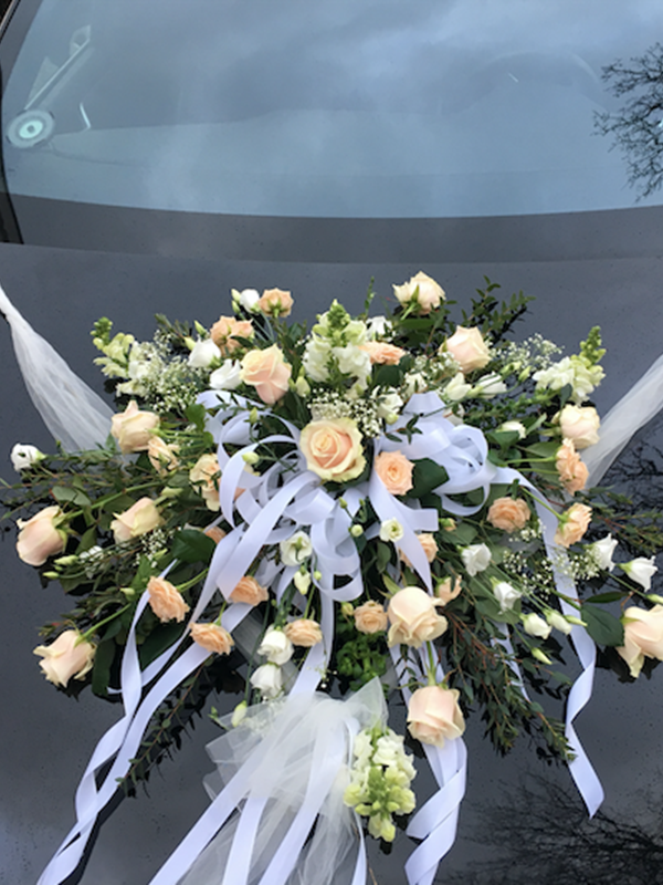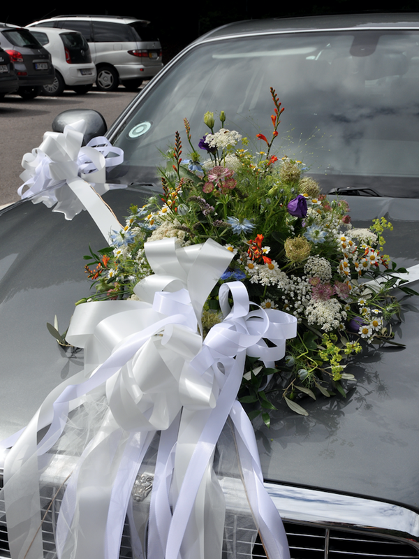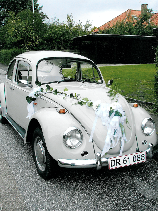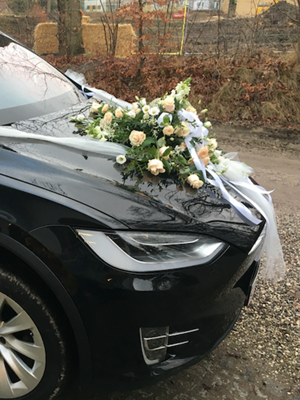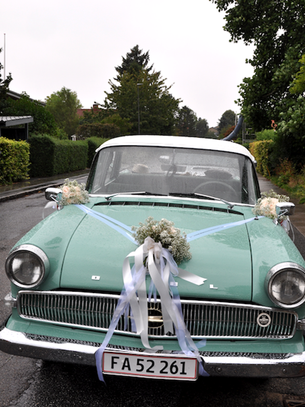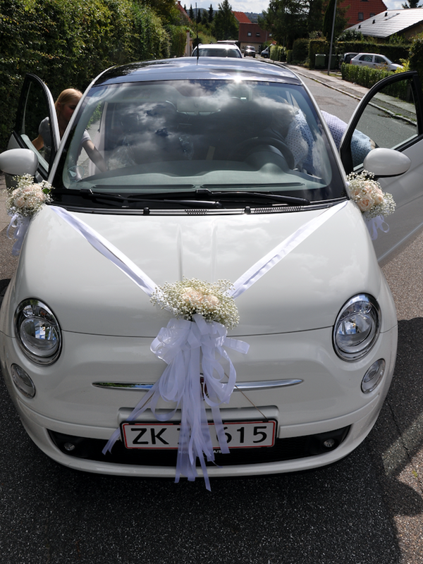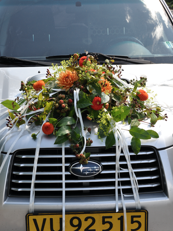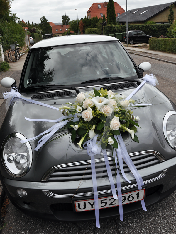 Bilpynt kan laves på mange forskellige måder, nogle typer kan I med lethed selv montere på bilen, andre skal monteres af mig på selve bryllupsdagen. Vi aftaler en tid, hvor bilen kommer ud til mit blomsterværksted – en påsætning tager ca. en halv time.